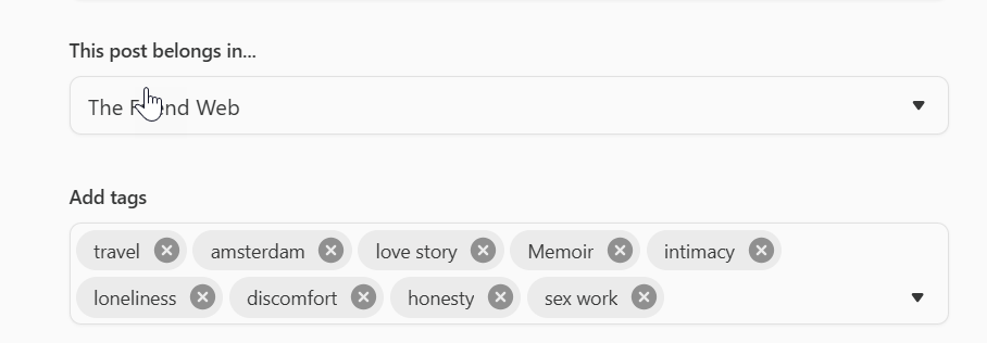 Before you paste, add your tags. They say five to nine is the right number for the algorithm to push them easily. Come up with any genres, styles used, ideas, symbols, and so on. For “I Fell in Love with a Prostitute Part 2,” here is what mine looks like.