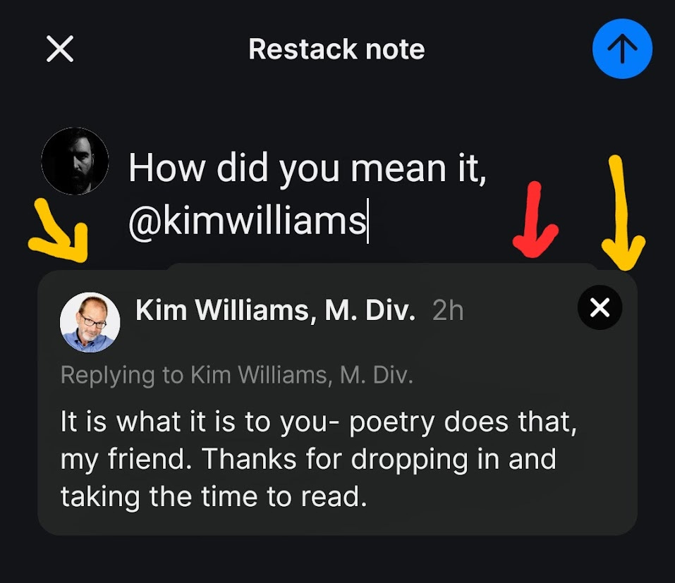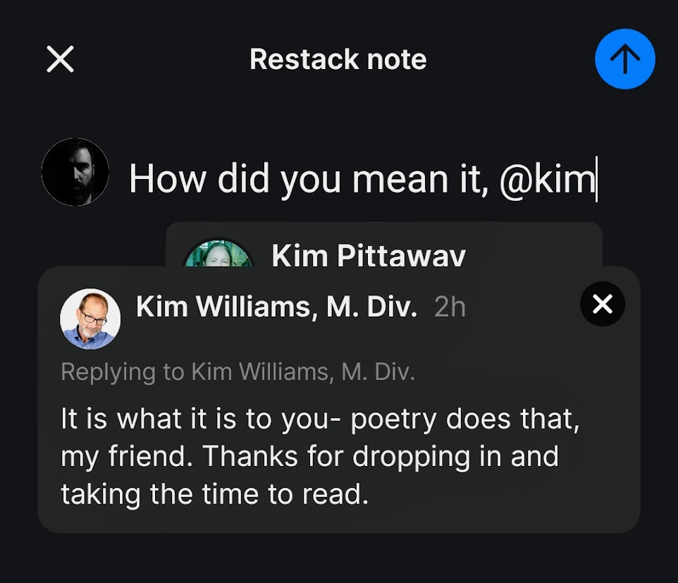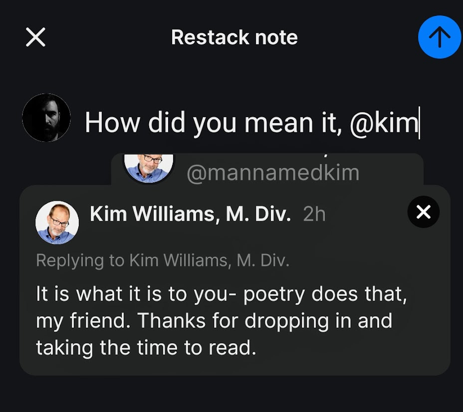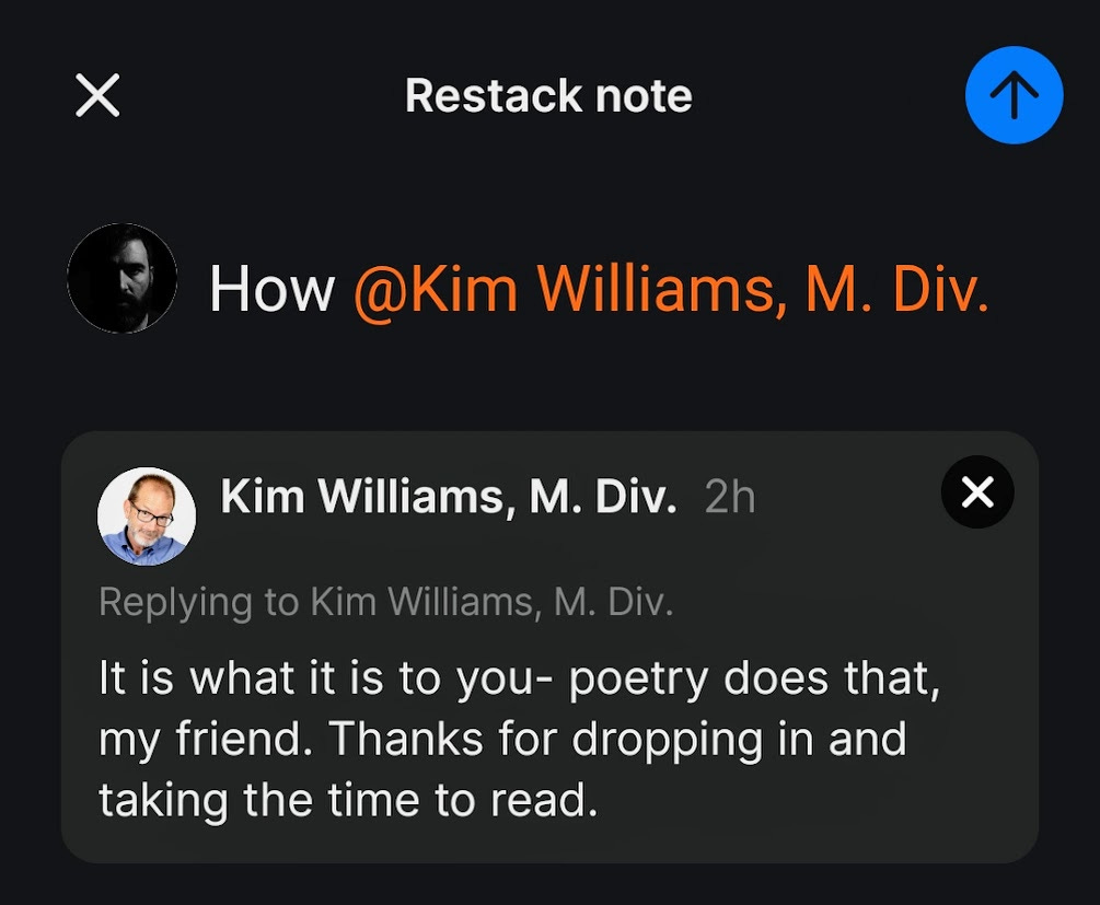 Some people have told me the restack with tag doesn’t work on a phone. This is not entirely true, but it looks that way. Let me demonstrate with a restack I just gave Kim Williams, M. Div.